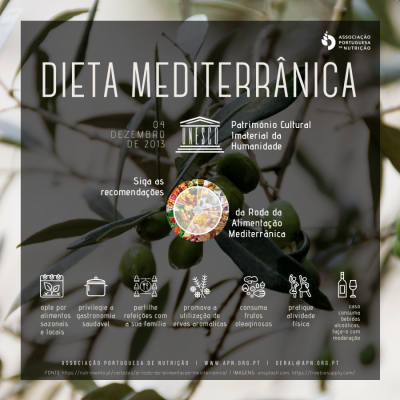 04 dezembro 2020A Associação Portuguesa de Nutrição assinala o 7º aniversário da Dieta Mediterrânica como Património Cultural Imaterial da Humanidade com uma infografia onde poderá consultar alguns princípios da alimentação e estilo de vida mediterrânicos.