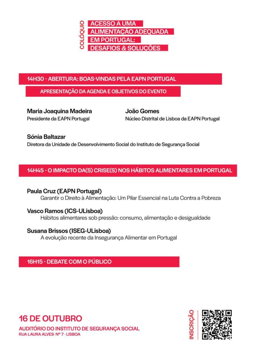 14 outubro 2025A Associação Portuguesa de Nutrição marcará presença no Colóquio "Acesso a uma alimentação saudável em Portugal: Desafios e Soluções", organizado pelo ICS-ULisboa e pela Rede Europeia Anti-Pobreza, que terá lugar no dia 16 de outubro, data em que se assinala o Dia Mundial da Alimentação.