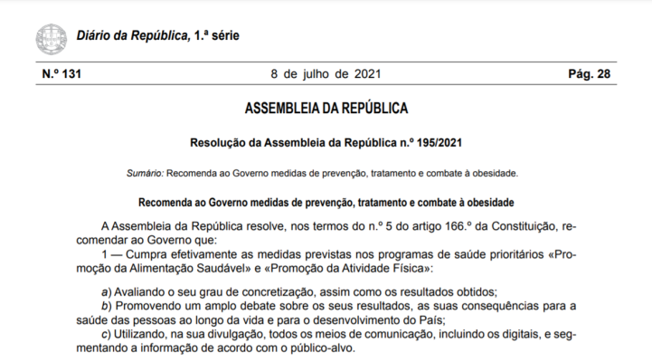 Resolução da Assembleia da República n.º 195/2021 - Recomenda ao Governo medidas de prevenção, tratamento e combate à obesidade.